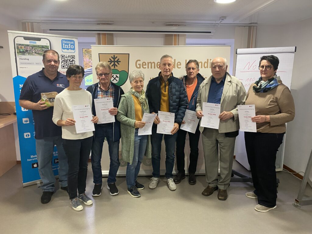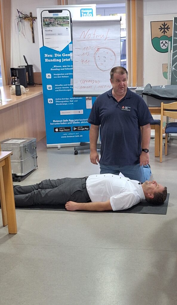 Am 16. Oktober fand im Gemeindehaus Hunding ein Erste-Hilfe-Kurs speziell für Seniorinnen und Senioren statt. Insgesamt nahmen sieben Teilnehmerinnen und Teilnehmer teil – und dank des spontanen Engagements unseres Bürgermeisters, der sich als achter Teilnehmer anschloss, konnte der Kurs wie geplant durchgeführt werden.