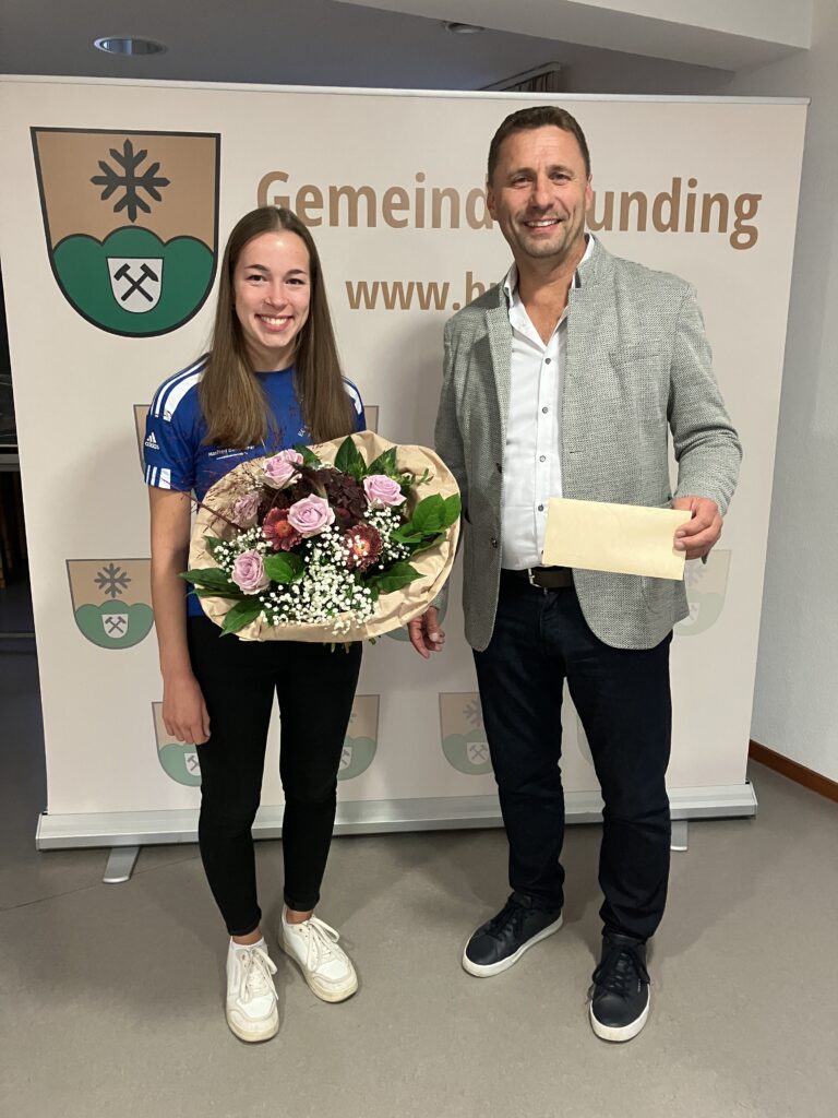 Mit einem ansteckenden Lächeln nimmt die sympathische und erfolgreiche Stockschützin Stefanie Schmid, die Glückwünsche von Bürgermeister Thomas Straßer entgegen.